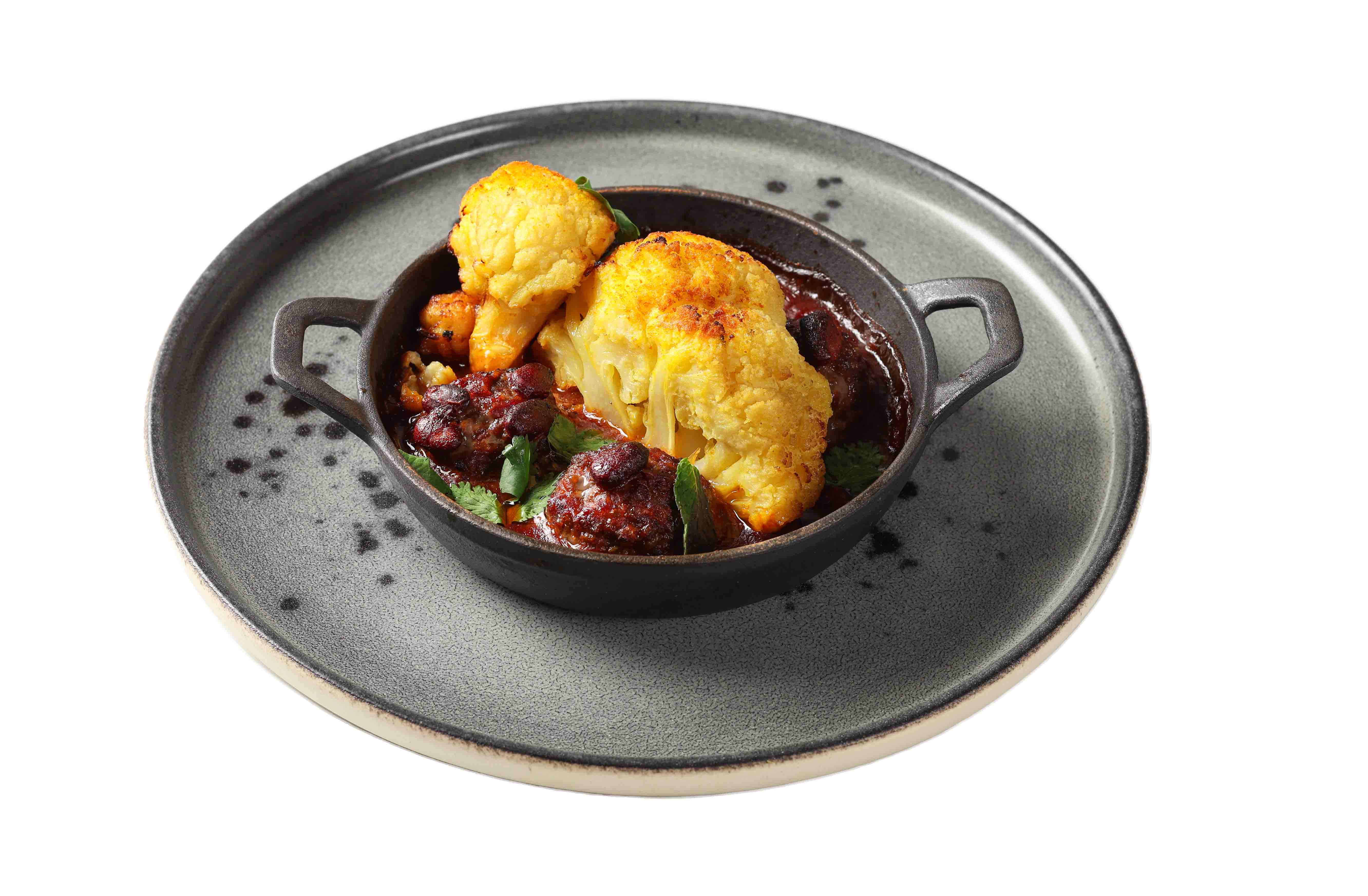 Томленая в дубовых листьях нежная щека телёнка с пюре из нута,гороха и картофеля