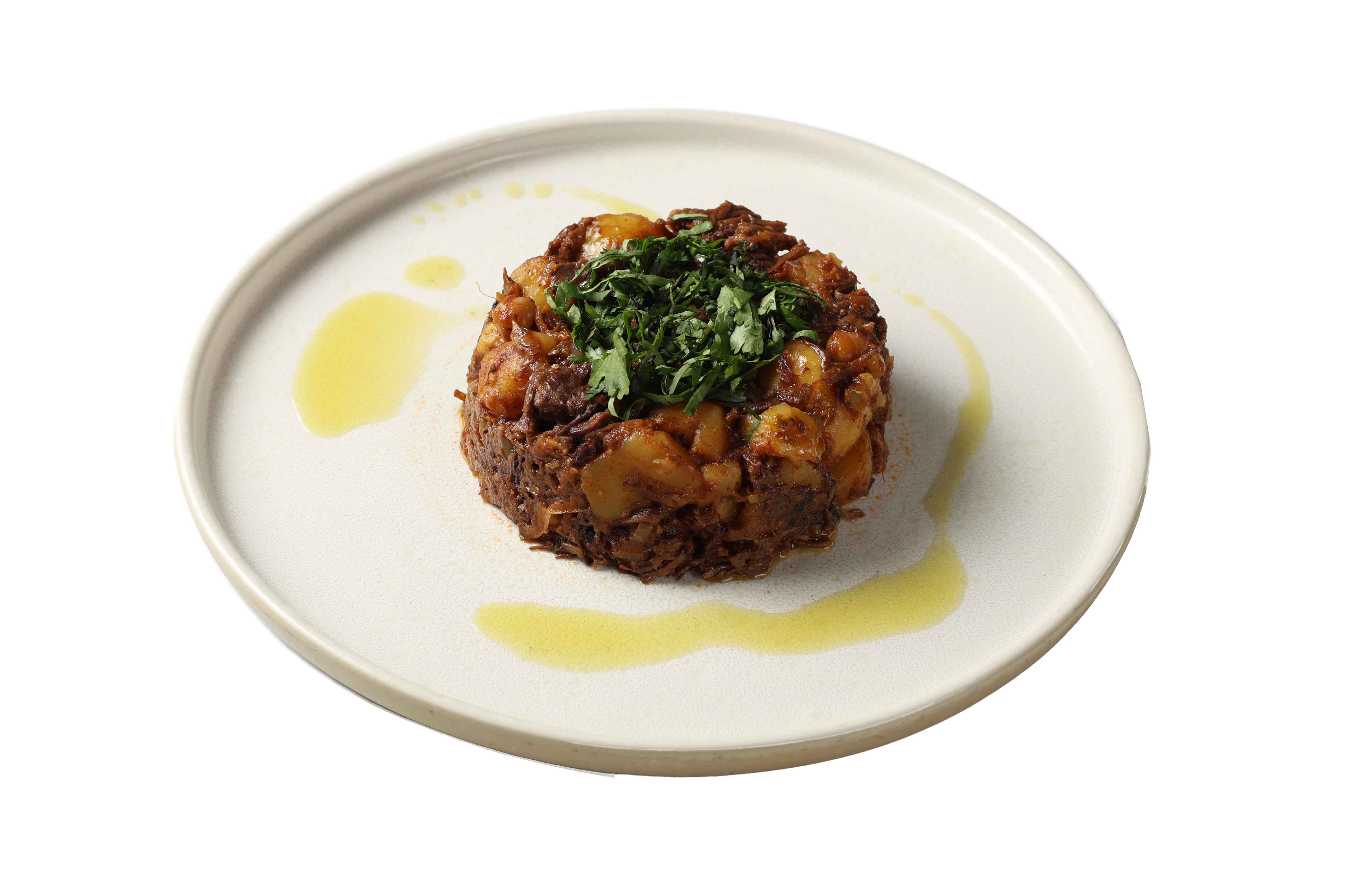Обжаренное сердце быка со специями, черносливом, шампиньонами и луком, подается с картофелем пай.