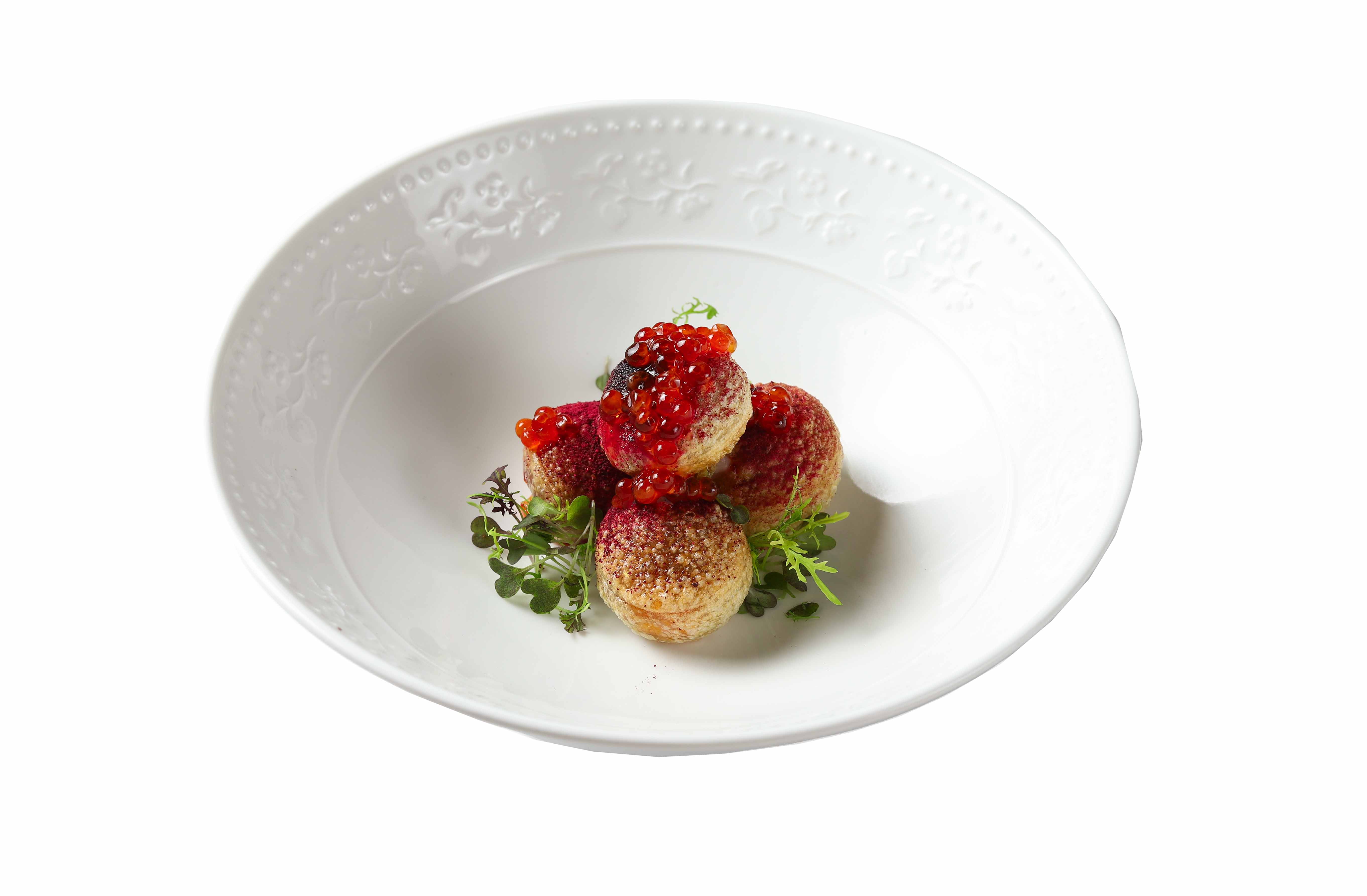 Классическое французское блюдо на манер запеканки под сливочным муссом из пармезана с добавлением двух видов икр: лососевой и щучьей