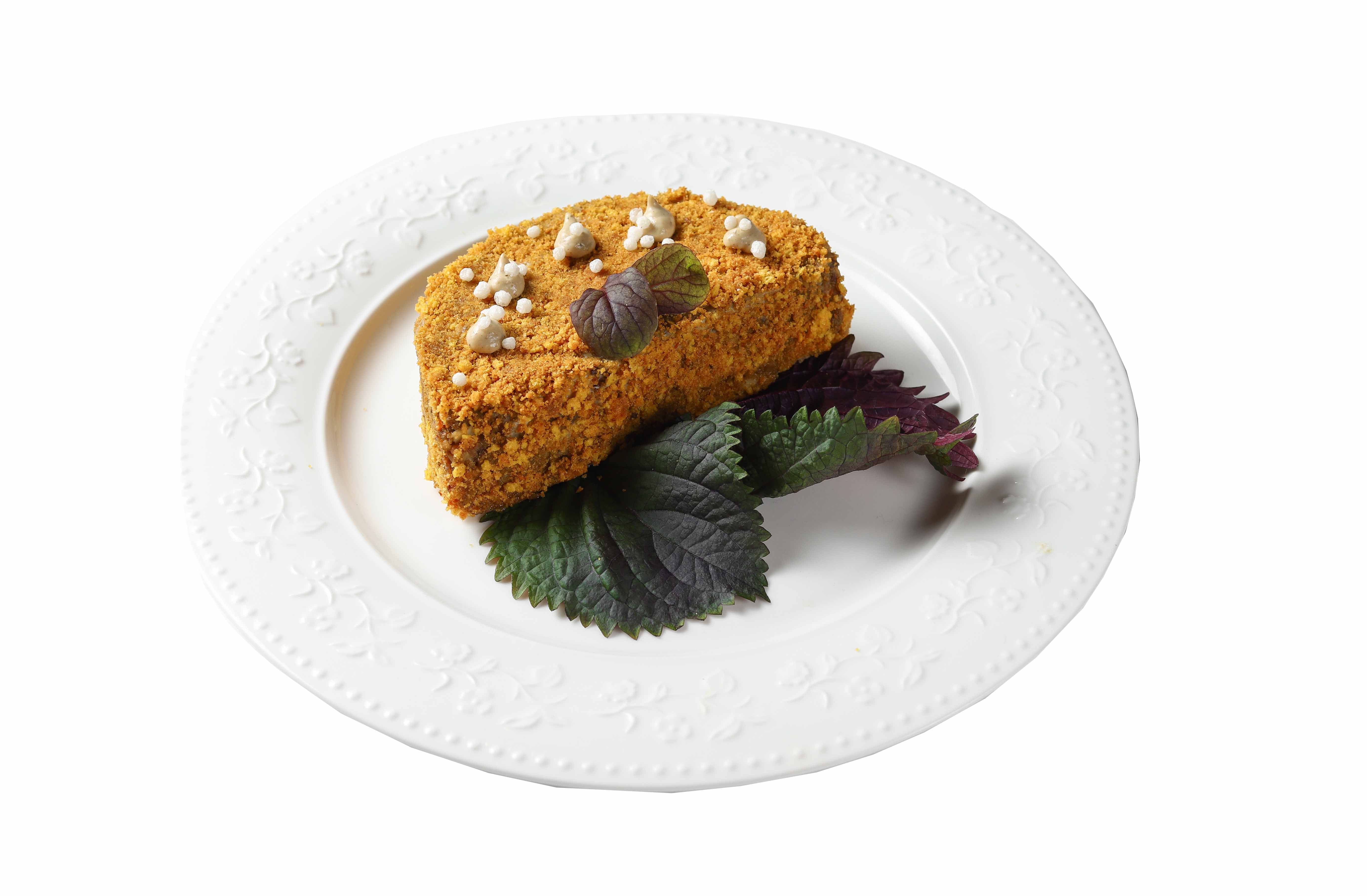 Карамелизированная в меду морковь со страчаттелой и нежным муссом из пармезана, украшенная попкорном из гречки.