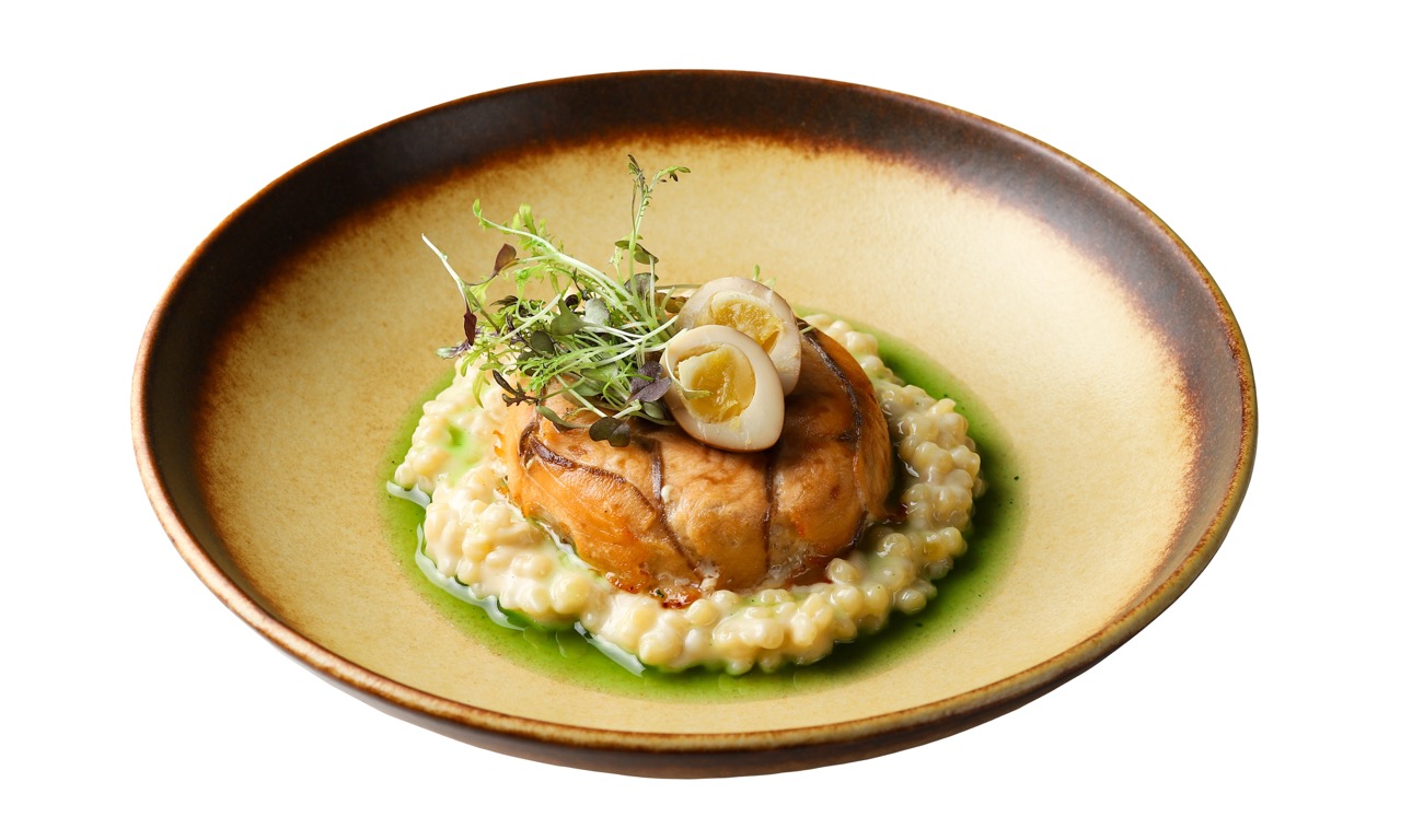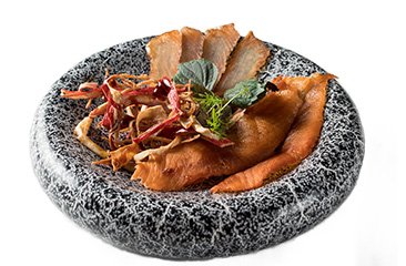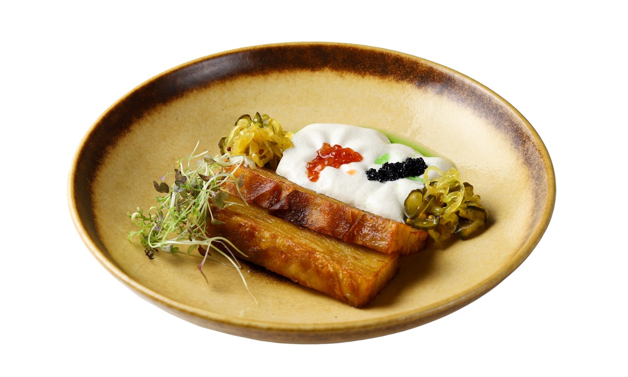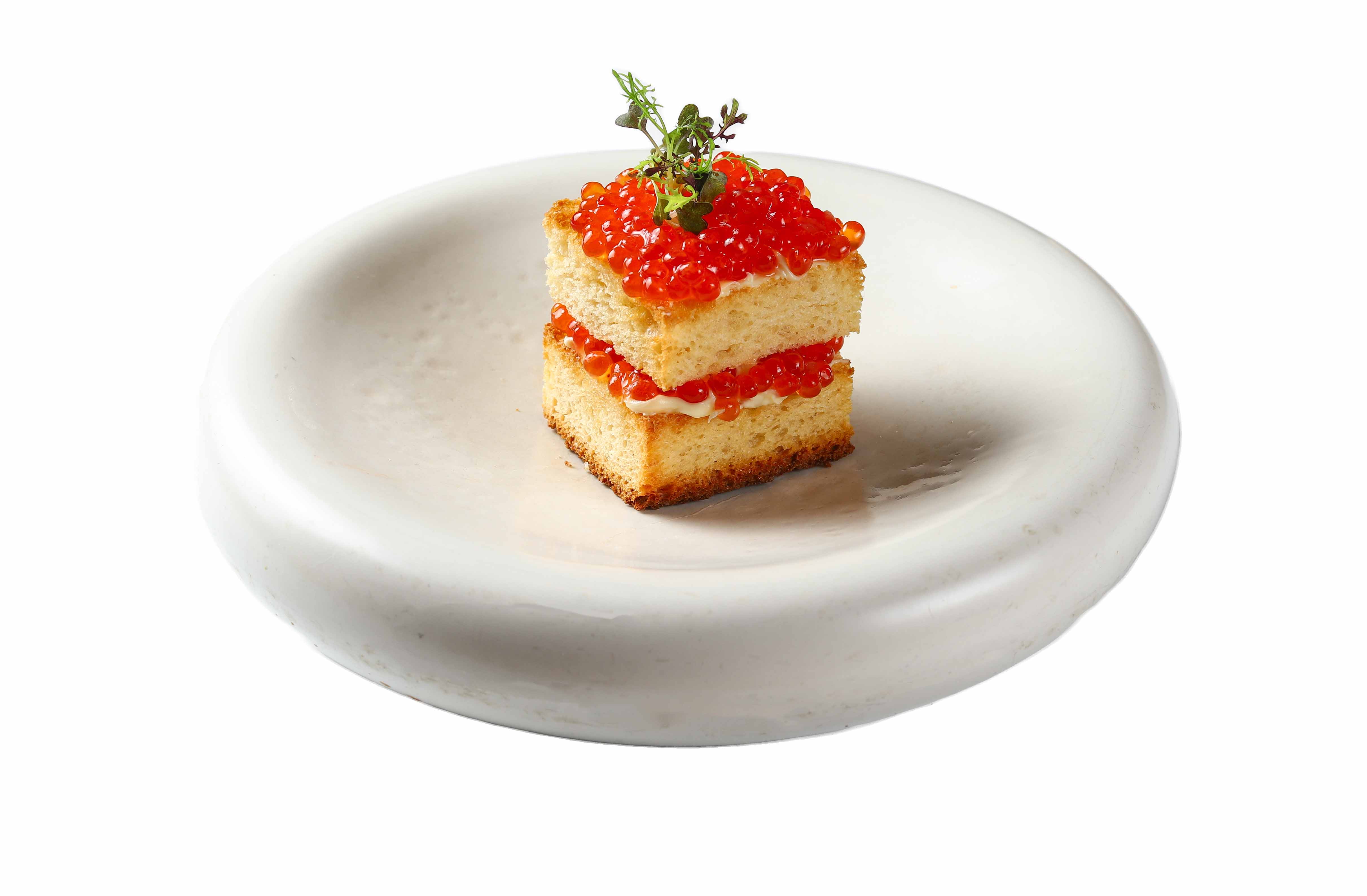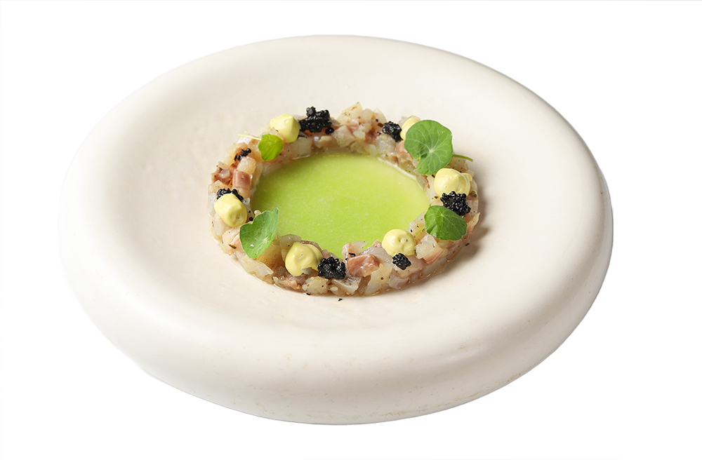 Нежное филе дорадо, его чистый вкус усиливается пикантной икрой палтуса с трюфельным шлейфом в сочетании с огуречной водой и укропным майонезом.