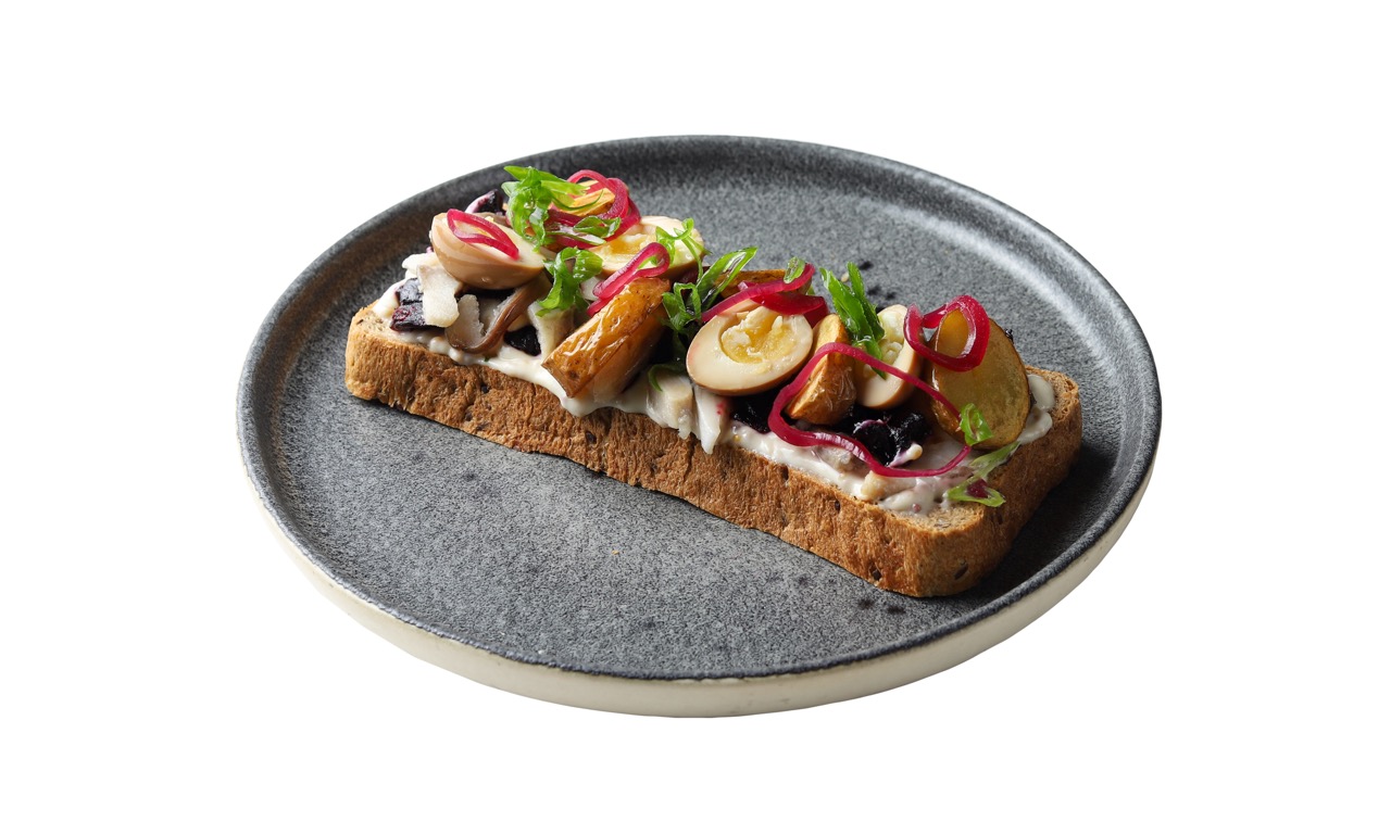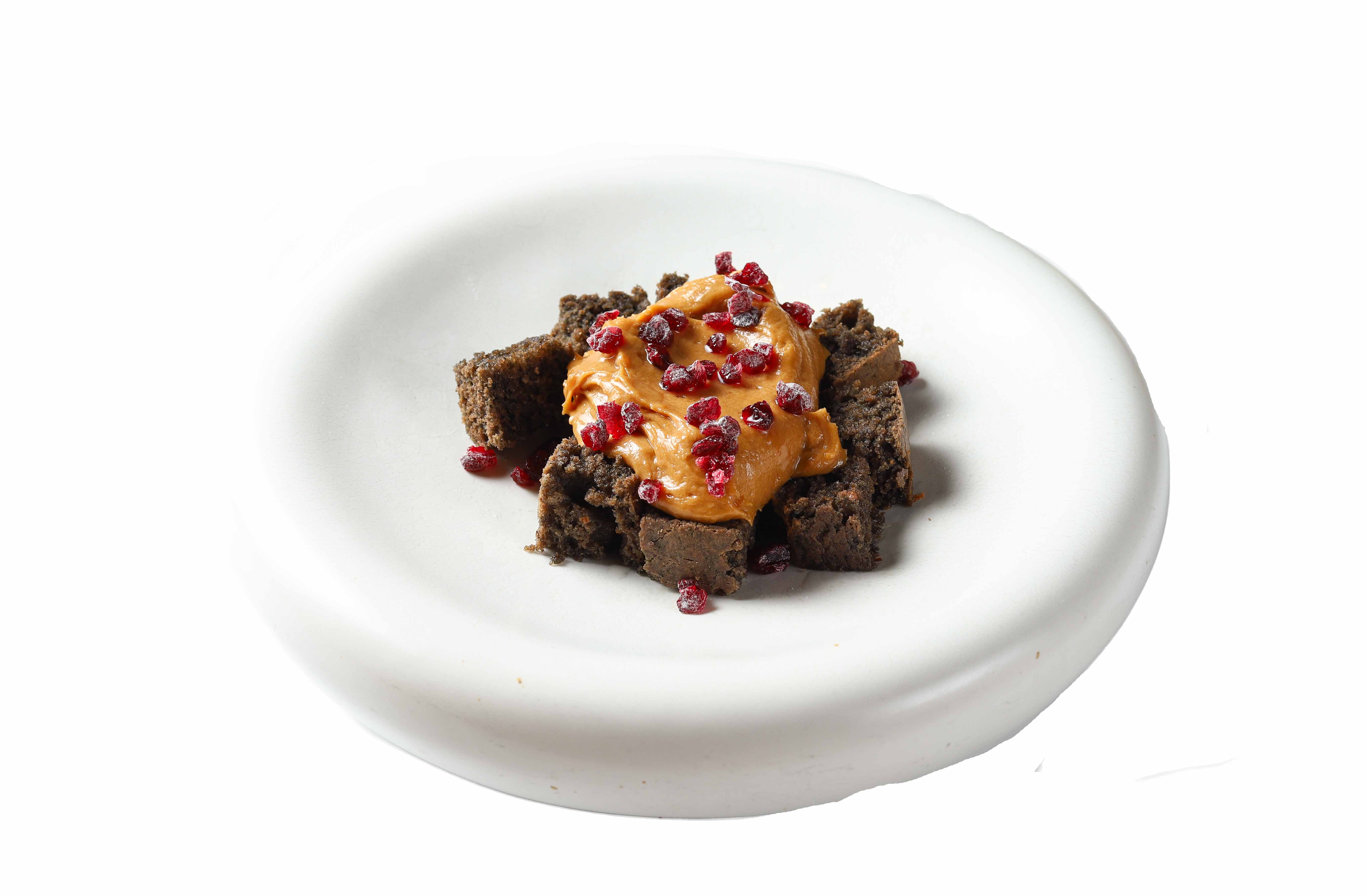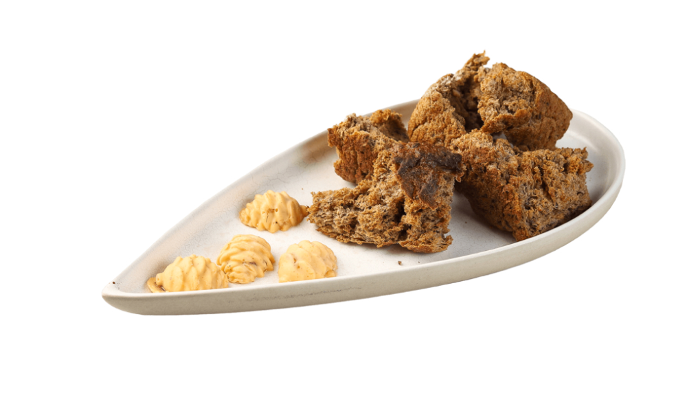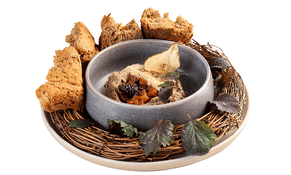 Паштет из куриных сердечек и печени с добавлением сливок, варенье из шишек и тутовника с опаленным хлебом 8 злаков, посыпка из ореха пекан.