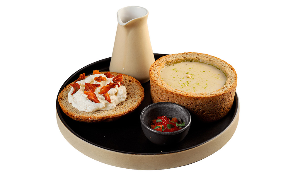 Нежная сливочная уха в домашнем хлебе на основе лосося и судака, с картофелем и конкоссе из томатов и икры