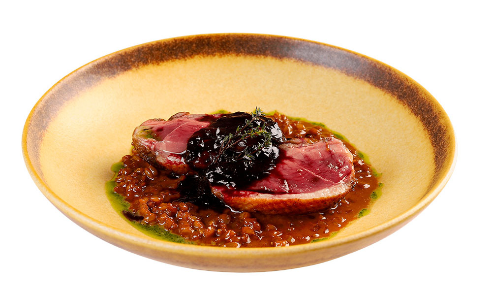 Утиное филе доведенное до идеальной сочности в сочетании с кисло-сладким соусом из жимолости и гарниром в виде полбы томленой в солоде
