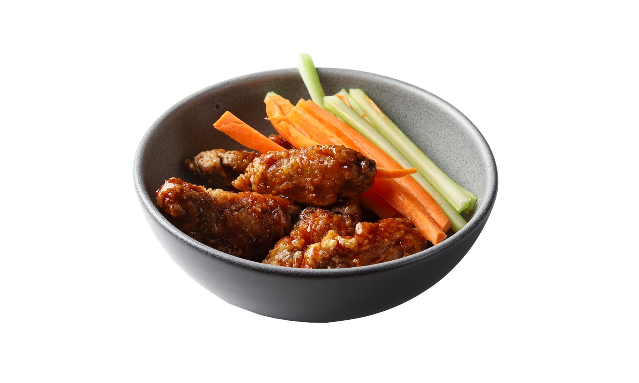 Куриные крылья ферментированные в цитрусе со свежими овощами: сельдереем и морковью, сухарями панко и брусничным соусом