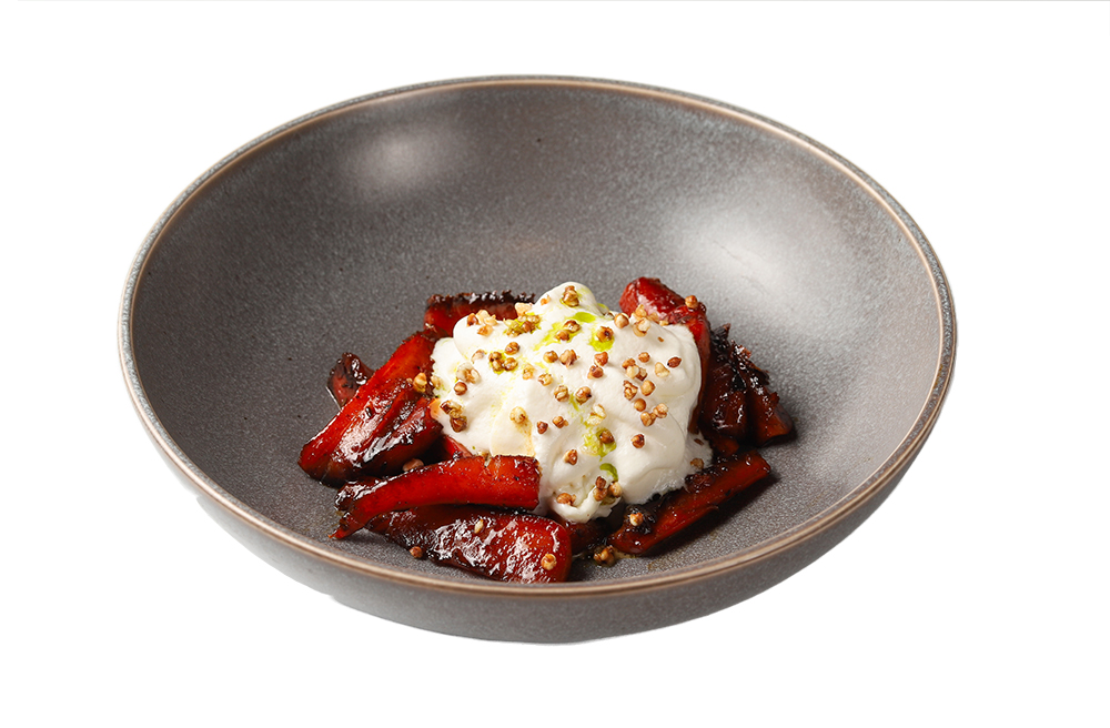 Карамелизированная морковь со сливочным муссом и страчателлой