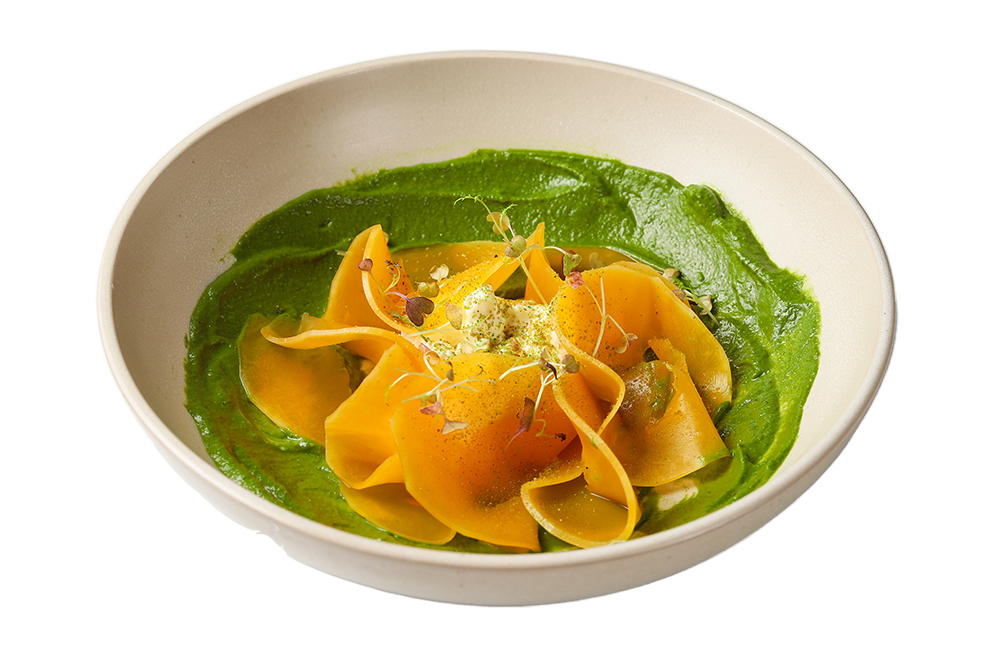 Осень в тарелке. Нежнейшие,почти прозрачные лепестки сладковатой тыквы маринованные в рисовом уксусе в сочетании с пикантным песто из рукколы и нежной страчаттеллы.