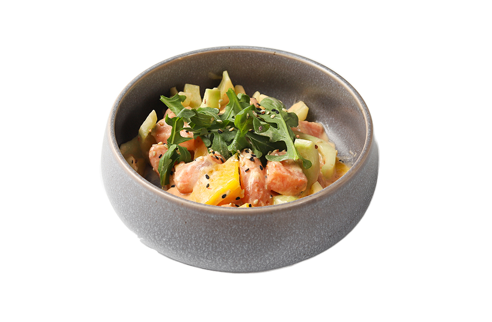 Лосось замаринованный в соке лайма в сочетании с тропическим манго, огурцом без кожи, заправленный соусом тайгер милк.