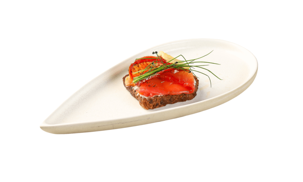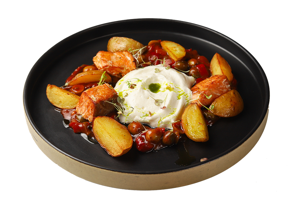 Сочное филе лосося на подушке из томленых томатов, сладкого болгарского перца, оливок и картофеля бейби под шапкой из сливочного мусса.