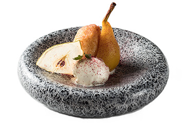 Швейцарский сыр раклет расплавленный на свече в сочетании со свежей грушей в панировке из сумаха, гренки из восьмизлакового хлеба и обжаренный бейби картофель.