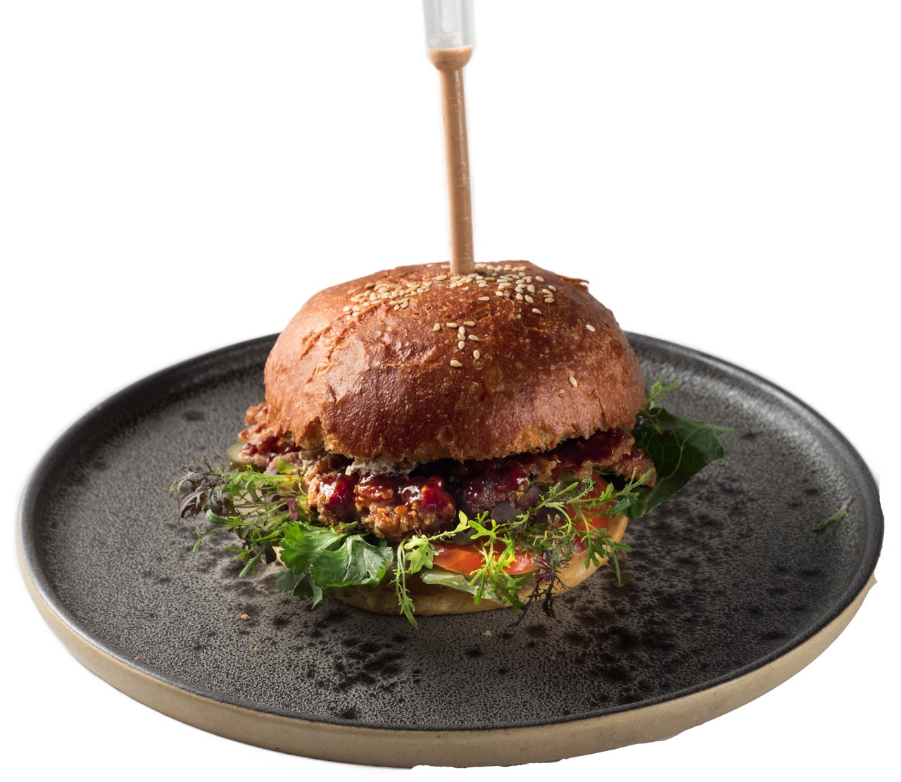 Бургер с котлетой из кабана с сыром Чеддер, томатами, ферментированными в можжевельнике огурцами, листьями салата Романо и домашним соусом