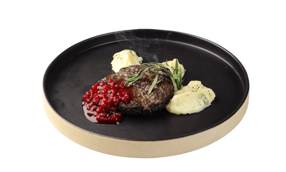 Сочный бифштекс из кабана под брусничным соусом в сочетании с толчёным картофелем с добавлением пармезана, сыра Монте Блун и лука пай