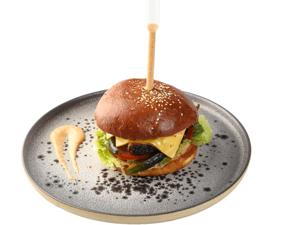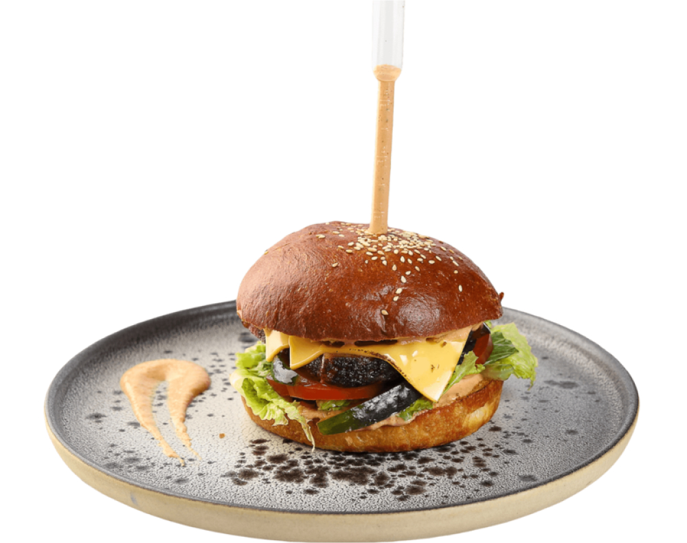 Бургер с томленой в смокере говяжьей грудинкой с сыром Чеддер, томатами, ферментированными в можжевельнике огурцами, листьями салата Романо и домашним соусом